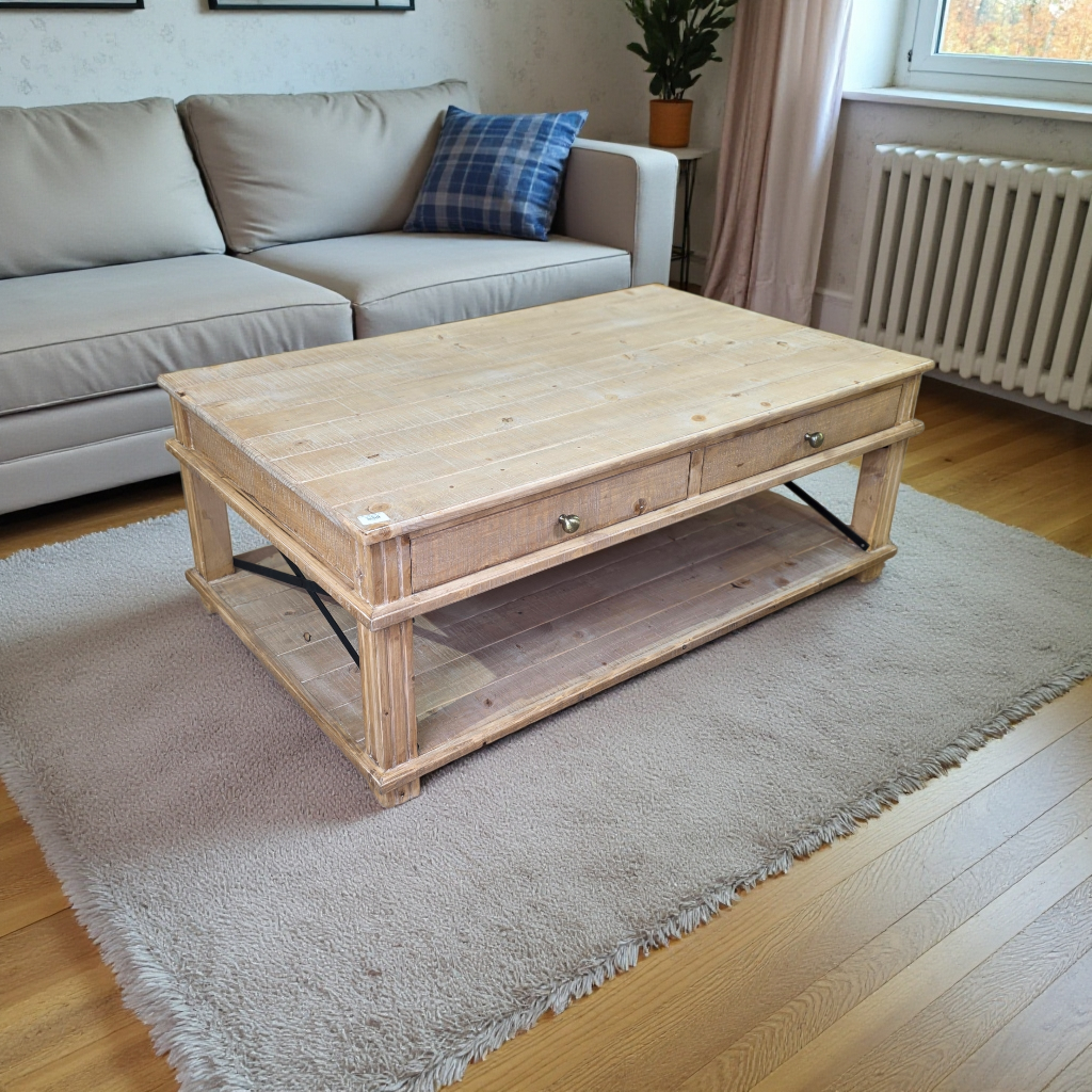 كل غرفة معيشة تحتاج إلى نقطة ارتكاز، وهذه الطاولة هي المرشح الأقوى. طاولة الوسط من الخشب الطبيعي ليست مجرد سطح لوضع القهوة، بل هي وحدة تخزين متكاملة وقطعة ديكور تملأ المكان بحضورها القوي وتصميمها الذي يجمع بين “الستايل الريفي” و”اللمسات الصناعية الحديثة”.