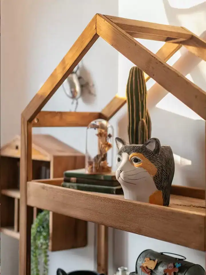 التصميم المعماري: هيكل خشبي جذاب على شكل منزل (House Shape) يحيط بمقتنياتك كإطار فني، ويضيف بعداً بصرياً وجمالياً لأي غرفة يوضع فيها.