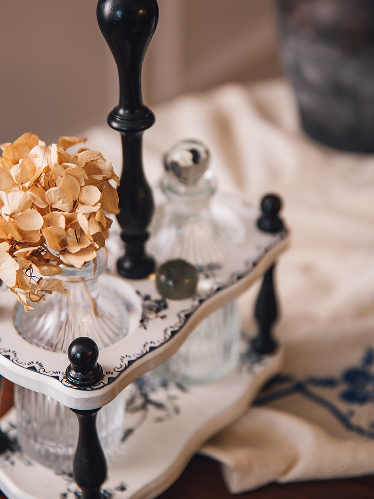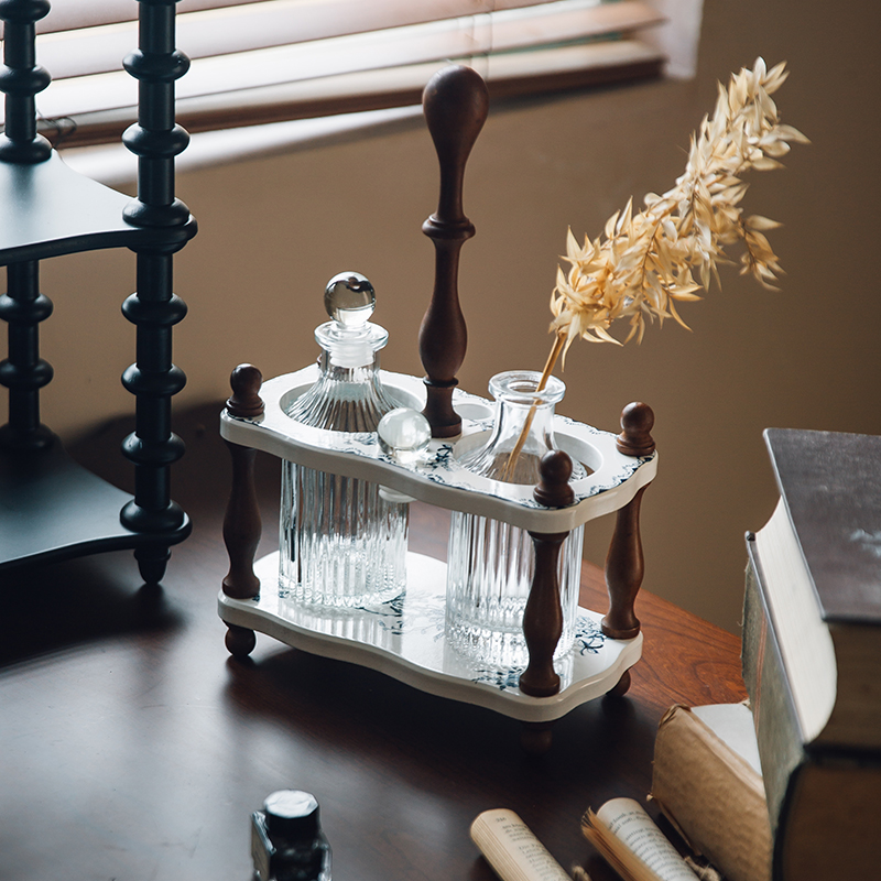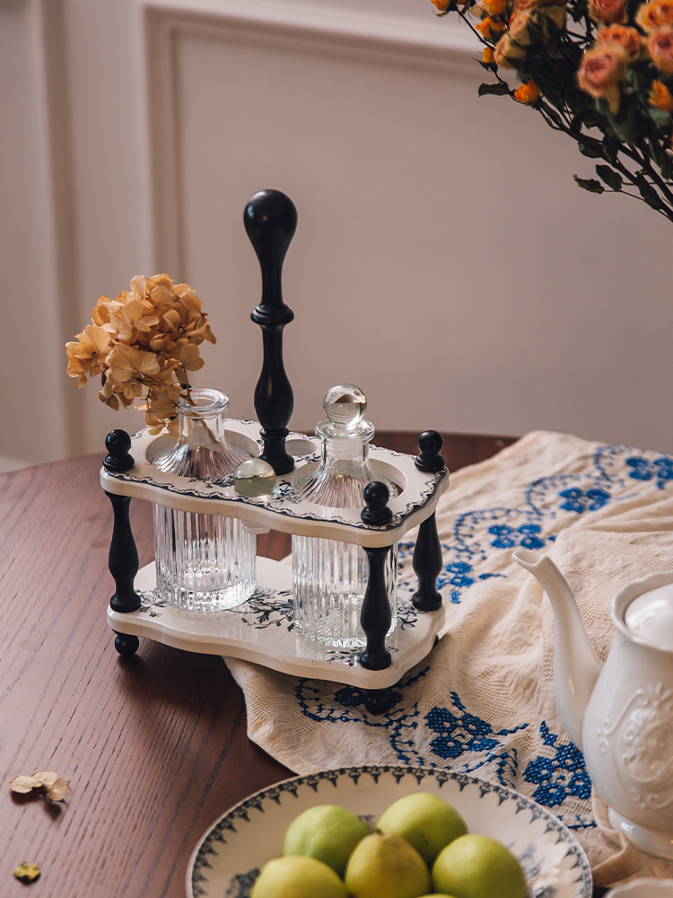 حامل خشبي فنتج: القوارير تستقر داخل حامل خشبي أنيق يجمع بين اللون الأبيض بنقوش زهور زرقاء كلاسيكية، وأعمدة ومقبض علوي باللون الأسود المخرط، لسهولة الحمل والتنقل.