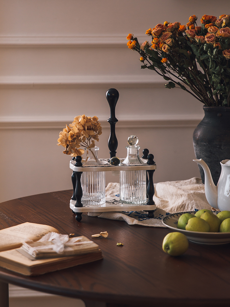 على مائدة الطعام (Cruet Set): املئي واحدة بزيت الزيتون البكر والأخرى بخل البلسميك. الحامل يسهل تمريرها بين الجالسين، والسدادات الكروية تجعل الفتح والإغلاق سهلاً وأنيقاً.
