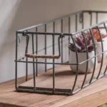 التصميم المزدوج: هيكل من المعدن الشبكي القوي باللون الرمادي، مع قاعدة خشبية طبيعية تضمن ثبات الأغراض وتضيف لمسة دفء ريفية.