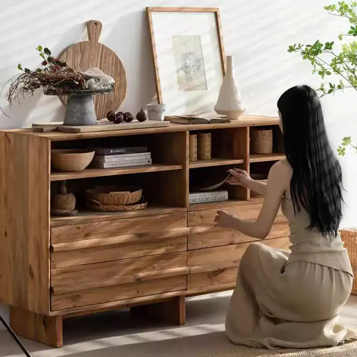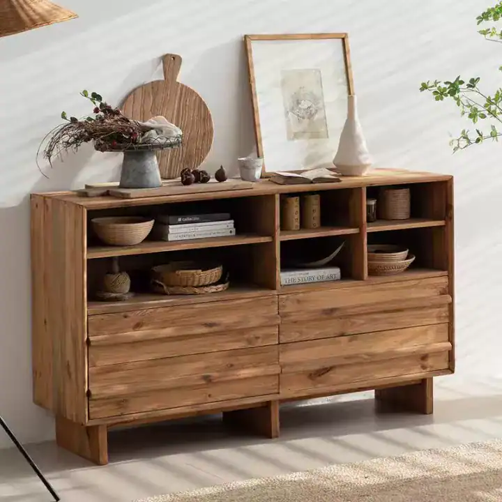 تخزين ذكي ومتعدد: يحتوي على 4 أدراج سفلية واسعة للأغراض الكبيرة، و 6 خانات مفتوحة مع رف وسطي لتنسيق الأكواب أو قطع الديكور.