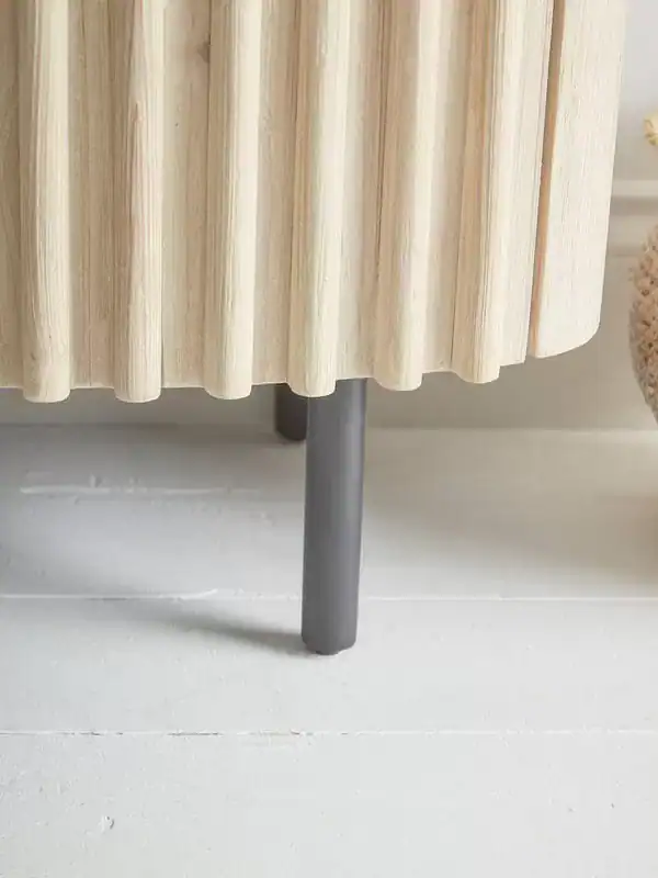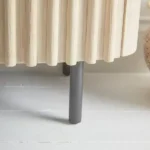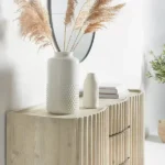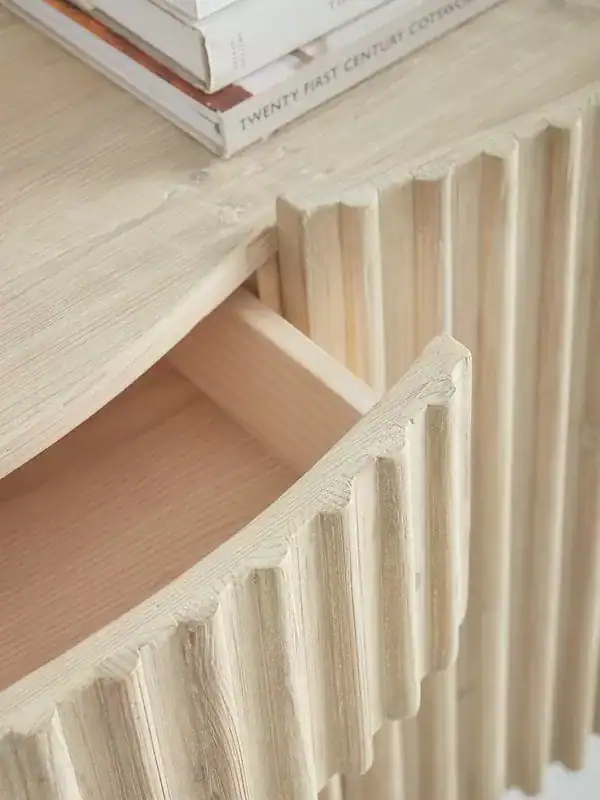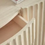 واجهة منحوتة (لمسة فنية): الواجهة ليست مسطحة تقليدية، بل تتميز ببروزات وتجاويف متموجة. هذا التصميم يضيف “ملمساً” (Texture) للمكان، ويجعل الكونسول يبدو أفخم بكثير من سعره، خاصة عند تسليط إضاءة “سبوت لايت” عليه.