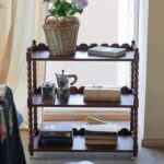 عربة تقديم “ترولي” خشب طبيعي ريفي 3 أدوار بحواف متموجة وكفرات