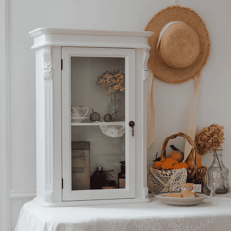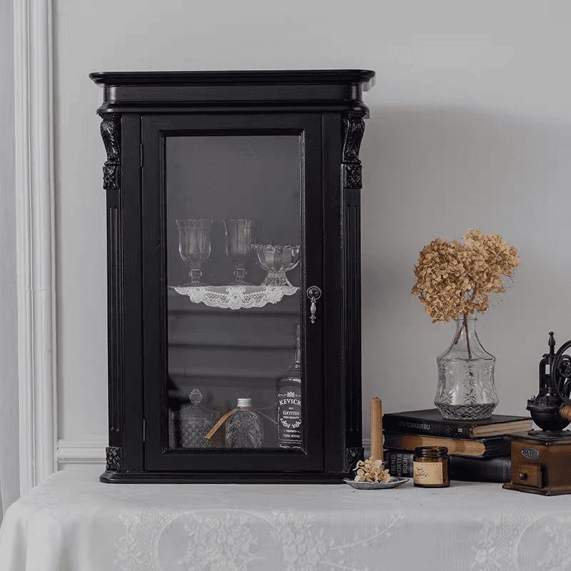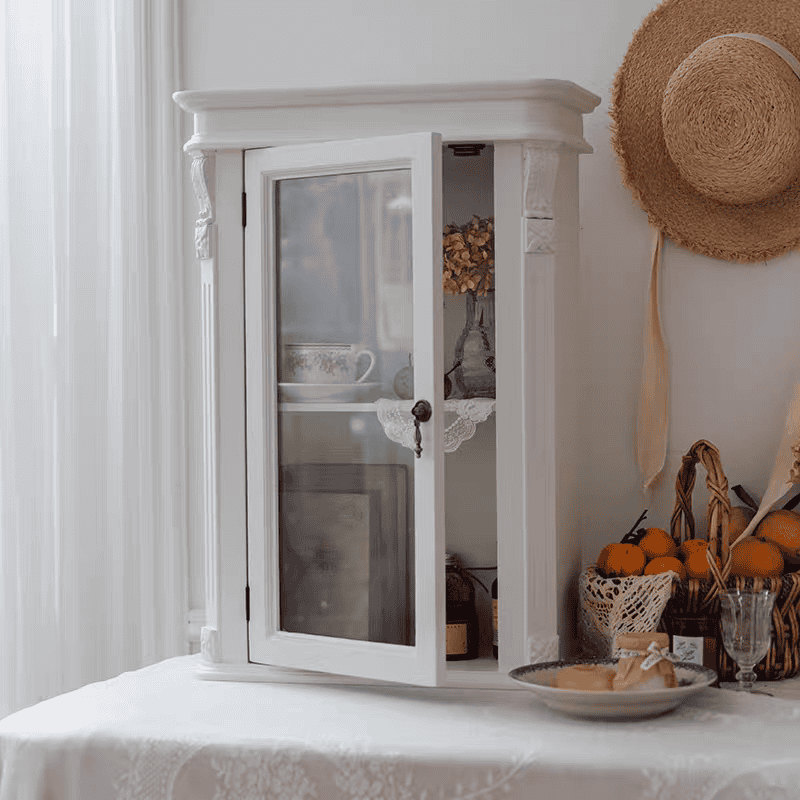 في ركن القهوة: استخدميه كخزانة معلقة فوق ماكينة القهوة لحفظ أكواب الفينتاج، برطمانات السكر، وعلب الشاي الفاخرة. الزجاج سيحميها ويجعلها جزءاً من العرض.