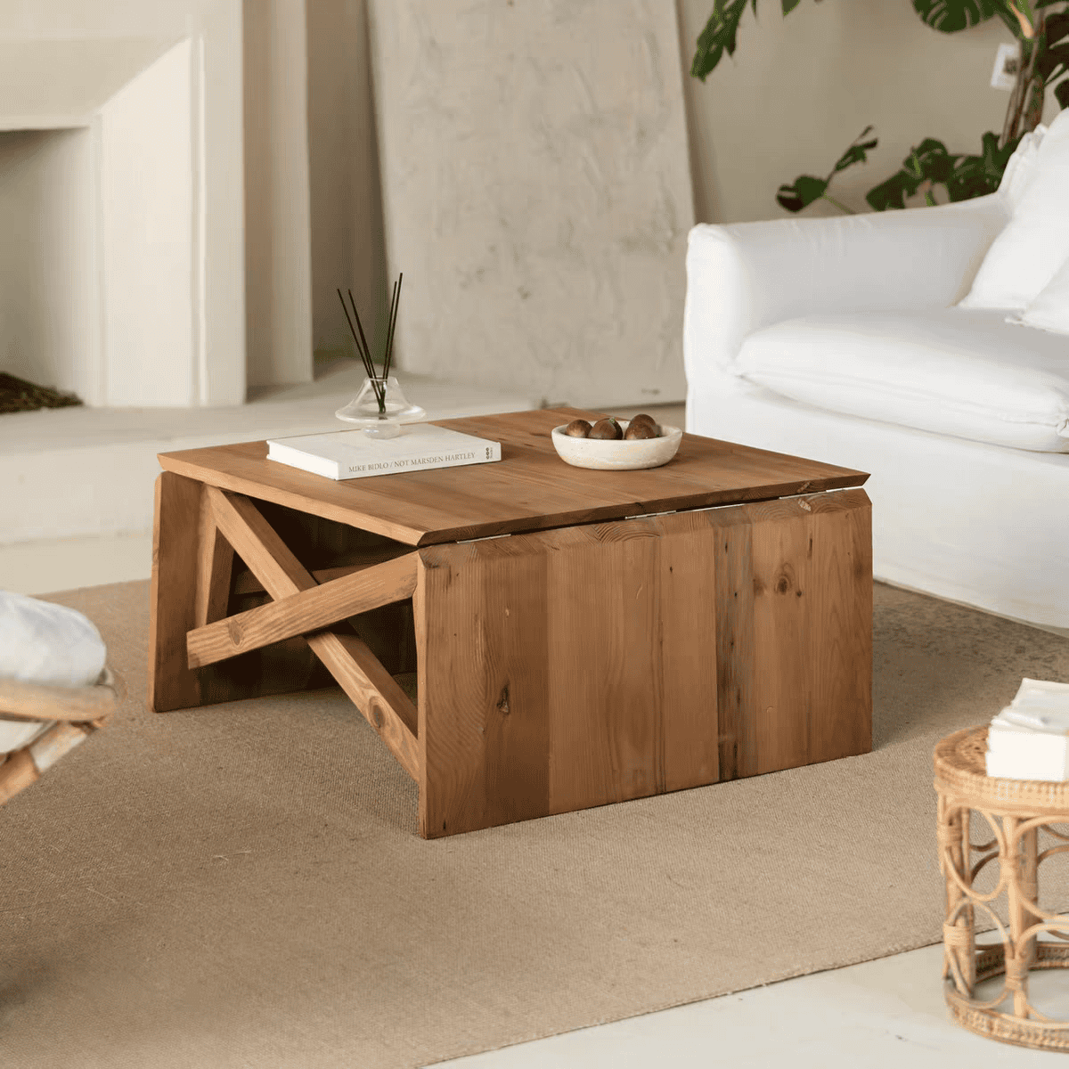 مرونة لا تضاهى: في الأيام العادية، هي طاولة قهوة (Center Table) أنيقة مربعة الشكل تتوسط مجلسك، تضعين عليها الكتب والتحف. وعند الحاجة (ولائم، عمل من المنزل، دراسة)، تتحول إلى طاولة كبيرة (156 سم) بارتفاع قياسي مريح للجلوس.