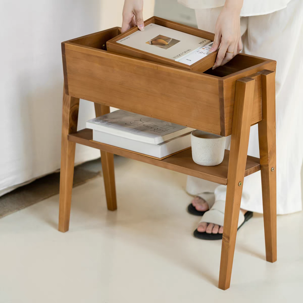 صندوق تخزين عميق: الجزء العلوي عبارة عن “حوض” خشبي مفتوح، مثالي لإخفاء أجهزة التحكم، النظارة، وكريم اليد، أو لحفظ المجلات والكتب بشكل طولي لمنع سقوطها.