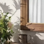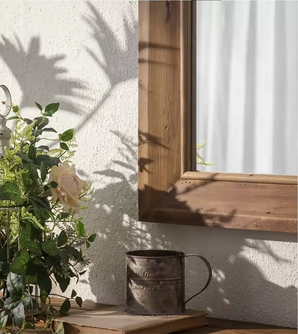 2. إطار خشبي طبيعي: الإطار الخشبي بتشطيبه الريفي يكسر حدة برودة الزجاج والجدران، ويضيف ملمساً (Texture) طبيعياً يرفع من قيمة الديكور ويجعله يبدو أكثر فخامة وحميمية.