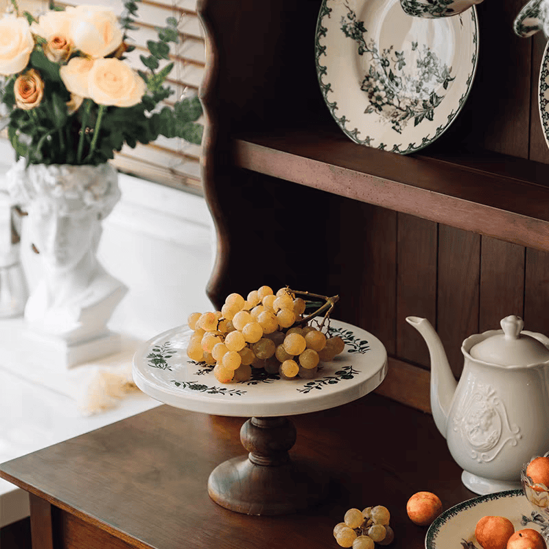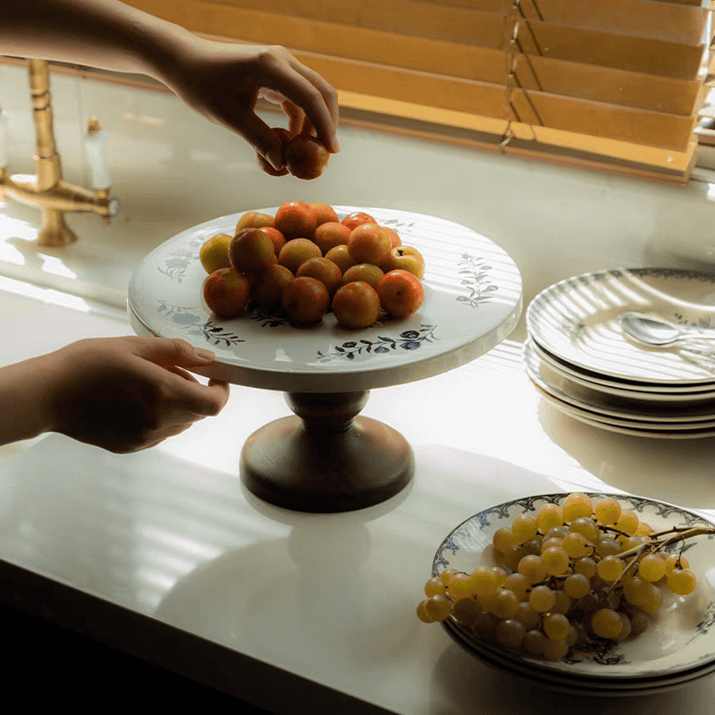 أنهي وجبتك أو استقبلي ضيوفك بلمسة من الرقي الأوروبي مع ستاند الكيك ذو القاعدة الخشبية. هذا الستاند يكسر القواعد التقليدية للزجاج والسيراميك، ليقدم لكِ قطعة صلبة ذات طابع فني، تجعل من الكيك أو الفاكهة التي تقدمينها تحفة للعرض.