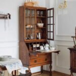 في غرفة الطعام (Dining Room): كما يظهر في الصورة، يمكن استخدامه كـ “بوفيه رأسي”؛ اعرضي أطقم الشاي في المكتبة الزجاجية، واستخدمي سطح المكتب لتحضير المشروبات أو ترتيب المناديل.