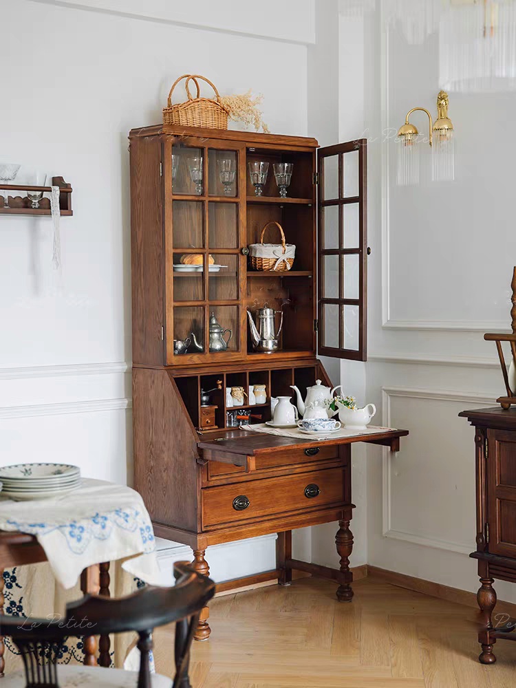مكتبة علوية (Display Hutch): الجزء العلوي عبارة عن خزانة بأبواب زجاجية مقسمة بإطارات خشبية (Mullions)، مثالية لعرض الكتب القيمة أو أطقم الشاي والفضيات وحمايتها من الغبار.