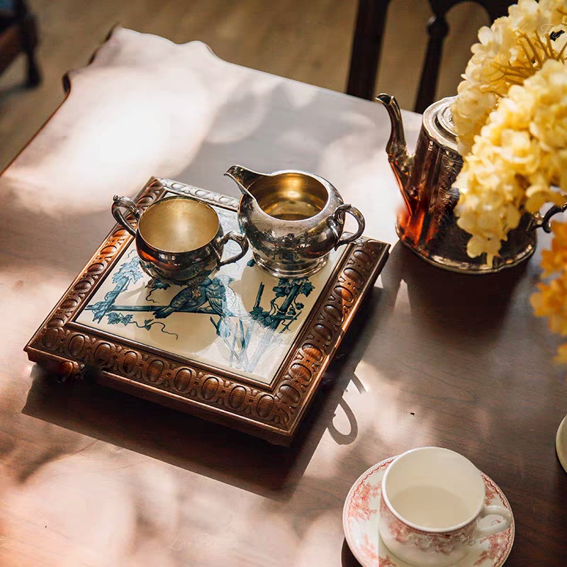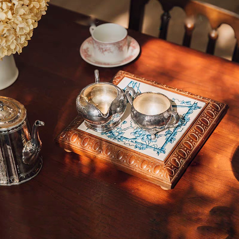 إطار خشبي منحوت: حواف الصينية مصنوعة من الخشب الطبيعي المحفور بنقوش وزخارف نباتية دقيقة تضفي فخامة كلاسيكية وتسهل الحمل.