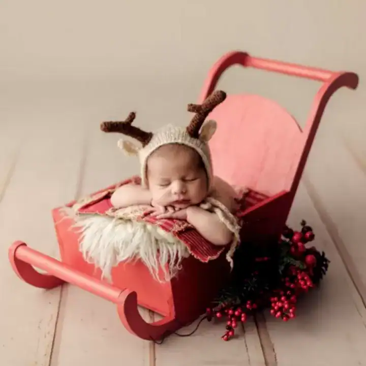 كادر تصويري متكامل: تعمل العربة كعنصر جذب بصري قوي يكسر رتابة الخلفيات السادة، مما يجعل المولود يبدو وكأنه في رحلة خيالية وسط الثلوج.